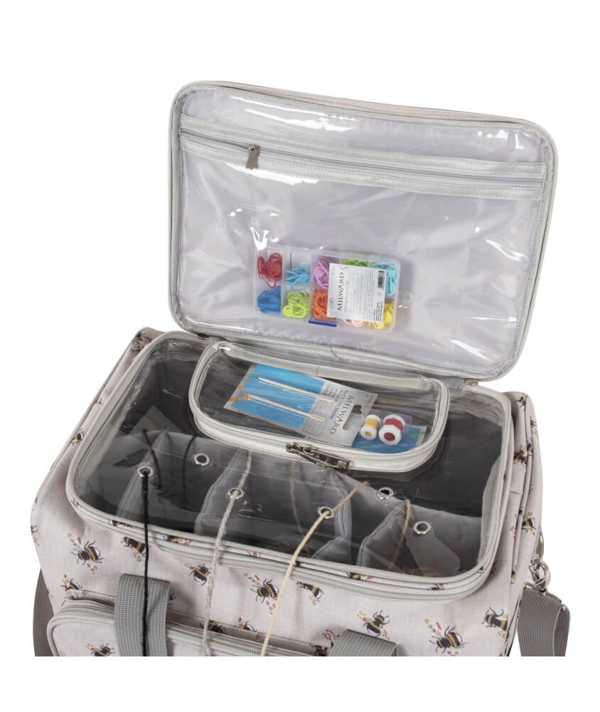 Doté de 6 œillets renforcés pour guider la laine, d’un couvercle supérieur transparent en PVC, de 4 grandes poches intérieures zippées et d’une bandoulière réglable, ce sac conjugue à la perfection ergonomie, capacité de rangement et design avec son imprimé abeille charmant et tendance.