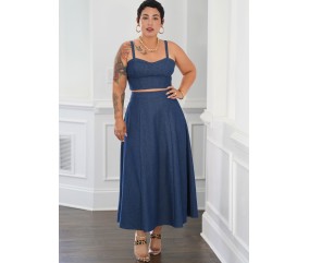 Corset court ajusté avec bonnets renforcés et armatures pour le soutien. Jupe à taille légèrement abaissée, disponible en deux longueurs. Fermetures zippées latérales pour le haut et la jupe. Tailles de bonnets pour Miss (B, C et D) et Femme (C, D et DD).