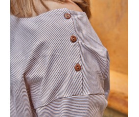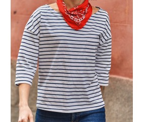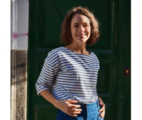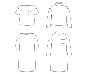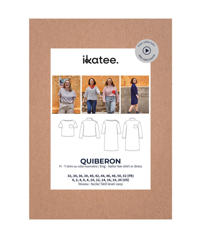 Quiberon est un patron de t-shirt marinière ou de robe pour femme. Ce modèle dispose de 4 options de manches : courtes, 3/4 et longues avec ou sans poignets. Deux finitions d'encolure vous sont proposées : une encolure bateau ou un col montant. On trouve sur le devant une poche poitrine. Une option ouverture à l'épaule et une option fente en bas de vêtement sont également disponibles.
