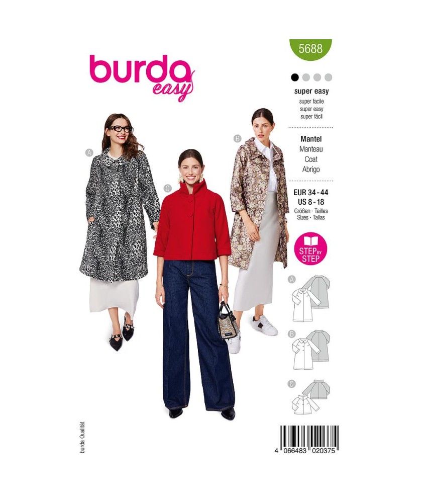 Ce patron de veste propose trois designs élégants au look rétro - idéal pour les débutants en couture. Le manteau longueur genou en jacquard léopard avec des fils brillants et un col bubon est à la fois élégant et sauvage. Le manteau sans doublure avec des boutons décoratifs et des boutons-pression est plus simple. La troisième variante de coupe est une veste courte et douillette en tissu de laine épais avec un col montant et des boutons décoratifs. Un must-have pour ton look d'automne.