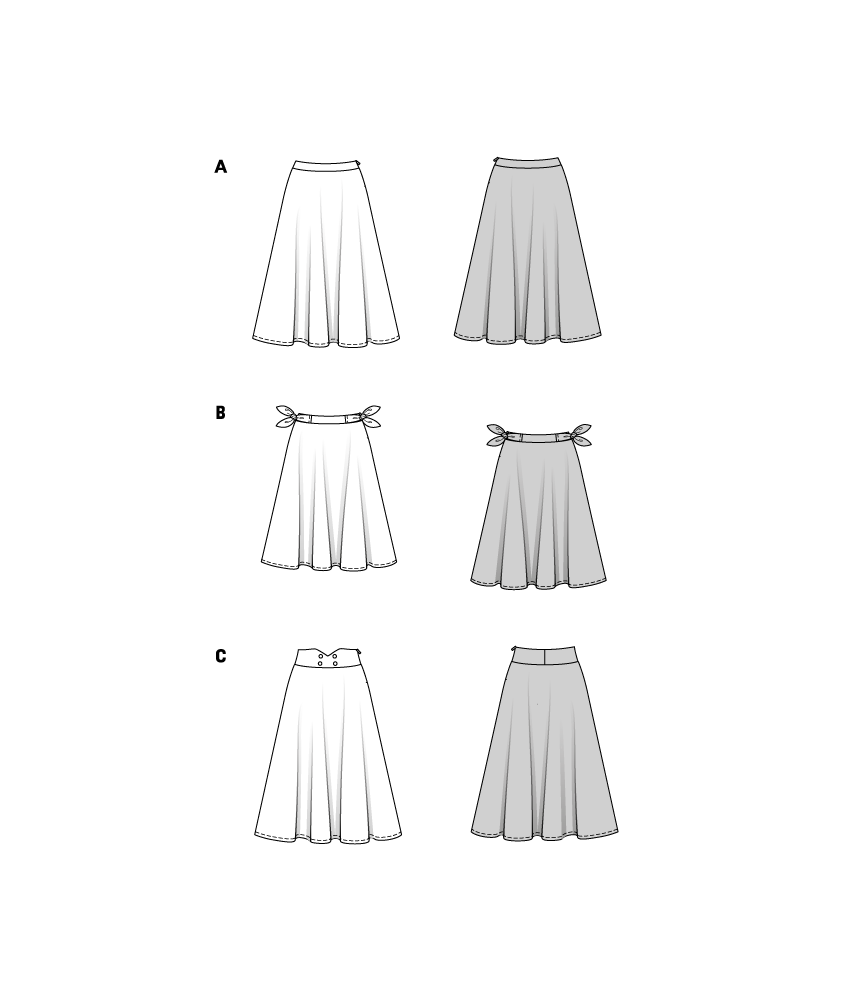 Découvre les derniers patrons de jupes pour débutants en couture ! La variante 1 propose une jupe fluide qui se balance, parfaite pour les cours de danse. La variante 2 allie le chic français et le rockabilly avec une jupe à carreaux vichy qui arrive au genou et des nœuds à la taille. La variante 3 crée une silhouette élégante avec une longue jupe cloche en denim jacquard, une large ceinture et des boutons - idéale pour les grandes occasions !