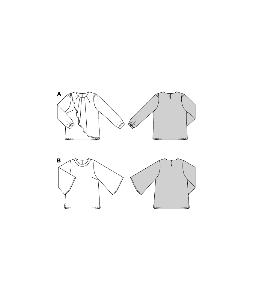 Ce patron te propose deux options polyvalentes pour la blouse et la chemise, idéales pour les couturières expérimentées. La tunique à encolure et manches trompettes dans le style des années 70 peut être portée aussi bien à la maison que de manière élégante avec un pantalon cigarette et des escarpins. Le deuxième patron séduit par son volant dramatique qui tombe élégamment grâce aux plis de l'encolure et par ses boutons en strass raffinés sur les poignets.