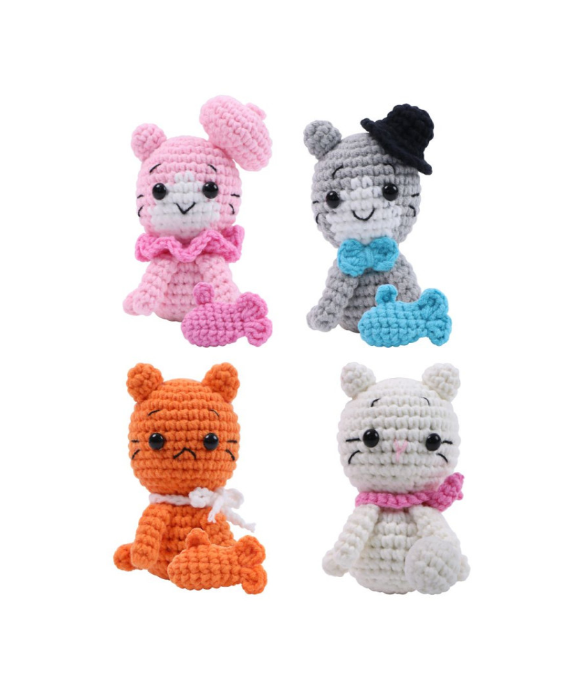 Ce kit vous propose de réaliser Les Quatre Petits Chats, un adorable quatuor de félins à crocheter soi-même, parfait pour débuter le crochet en toute sérénité.
