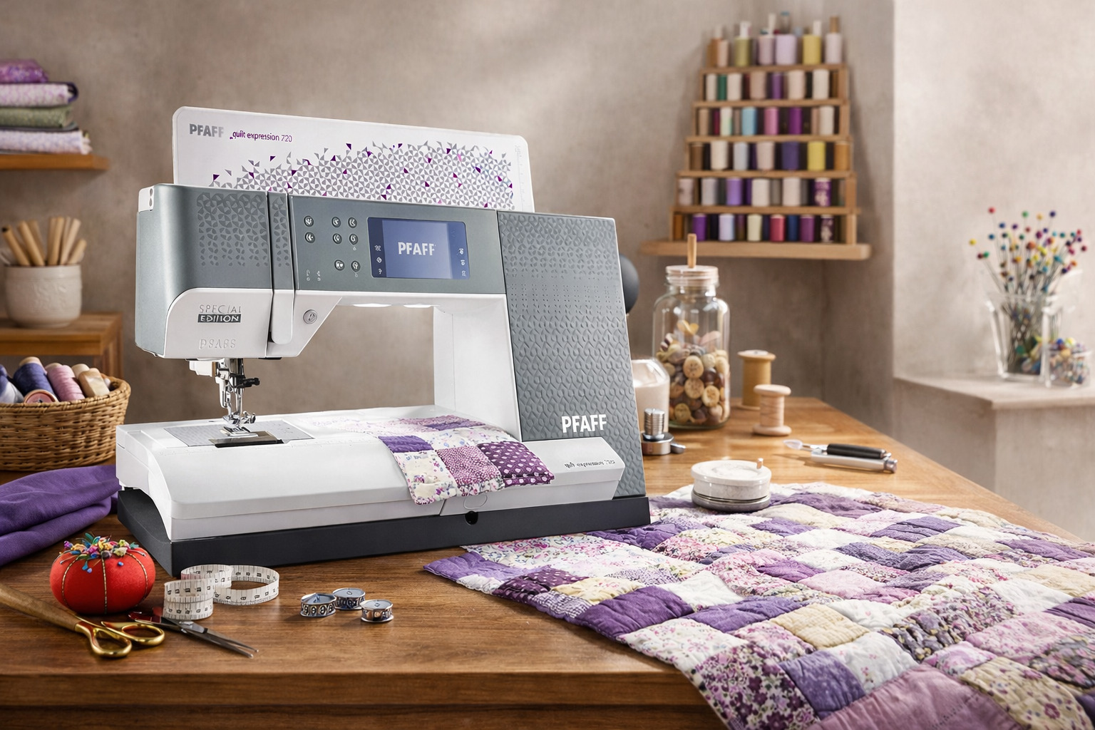 Élégante, puissante et résolument moderne, la PFAFF Quilt Expression™ 720 – Édition Spéciale incarne l’excellence du savoir-faire allemand au service de la couture et du quilting. Cette machine haut de gamme associe à la perfection la tradition PFAFF avec son célèbre double entraînement IDT™ et les technologies les plus avancées : écran tactile couleur, pied-de-biche automatique, mémoire de points et création de motifs personnalisés.