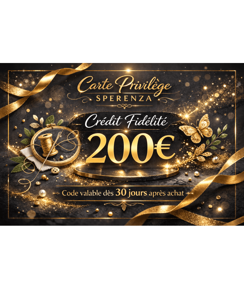 Avec la Carte Privilège Sperenza de 200€, offrez un budget créatif exceptionnel pour réaliser tous les projets couture, broderie, tricot ou crochet. Ce montant permet d'investir dans du matériel de qualité professionnelle : accessoires machines, fils premium, laines luxueuses et outils spécialisés. Le crédit fidélité est appliqué sur le compte client et utilisable librement sur l'ensemble du catalogue Sperenza. Idéale pour une couturière exigeante ou pour compléter un équipement haut de gamme. Un cadeau d'exception qui montre que vous connaissez sa passion. Faites-lui vivre une expérience shopping inoubliable chez Sperenza.