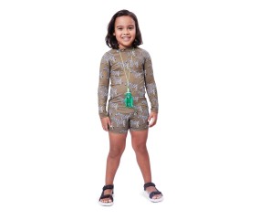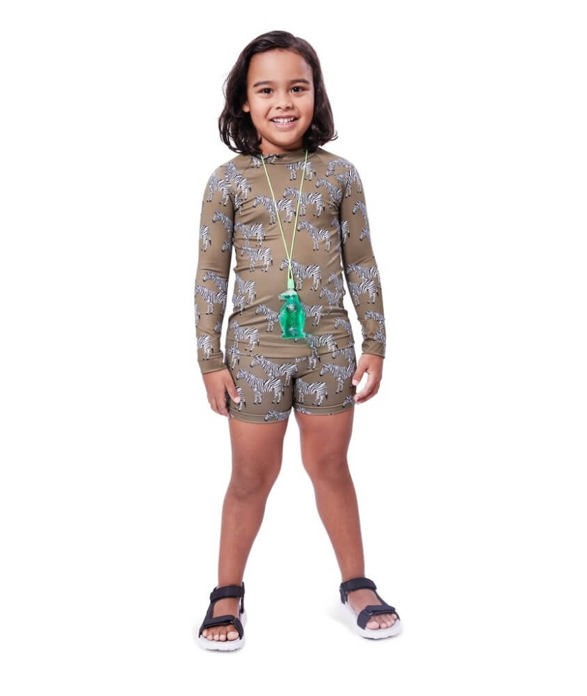 Look de plage parfait pour les petits surfeurs : le premier t-shirt vert olive séduit par son imprimé zèbre pour une touche d’aventure, tandis que le second t-shirt rayé à manches courtes avec col montant en orange vif et blanc protège du soleil et sèche rapidement après la baignade. Le short de bain mi-long épouse le corps sans limiter les mouvements. L’ensemble est complété par un bob tendance bleu marine ou imprimé vagues – un incontournable pour les journées ensoleillées au bord de l’eau.