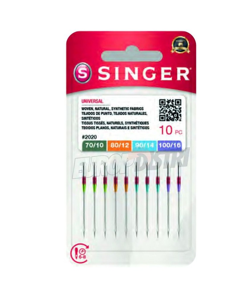 Les aiguilles SINGER 2020 Universal Assortiment 70-80-90-100 constituent la solution complète pour une couturière polyvalente. Ce paquet de 10 aiguilles couvre 4 tailles essentielles : n°70 (tissus très fins : organza, soie, voile), n°80 (tissus standards : coton, popeline), n°90 (tissus mi-lourds), n°100 (tissus lourds). La pointe légèrement arrondie convient à la grande majorité des tissus tissés. Plus économique que l'achat de paquets séparés, cet assortiment vous permet d'avoir toujours la bonne taille à portée de main. Compatibles avec toutes les machines SINGER domestiques.