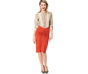 Une jupe moulante et élégante disponible en plusieurs longueurs, avec un froncé avant créé par un lien coulissant. Ceinture élastique, niveau super facile. Tailles 34 à 44.