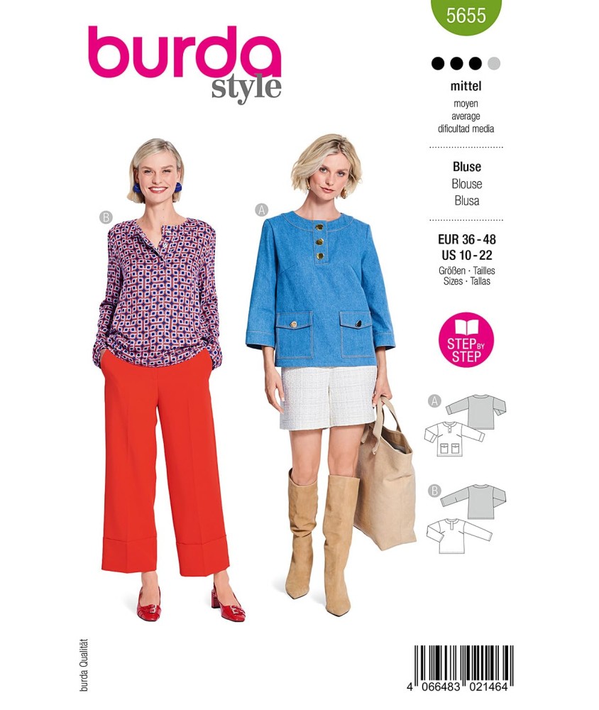 Élégant et intemporel, le Patron Burda Style n°5655 vous permet de confectionner un chemisier féminin à enfiler, dans un style décontracté-chic parfait pour toutes les occasions. Ce modèle polyvalent se porte aussi bien au bureau qu'en week-end, et s'adapte à de nombreuses matières pour des résultats toujours impeccables.