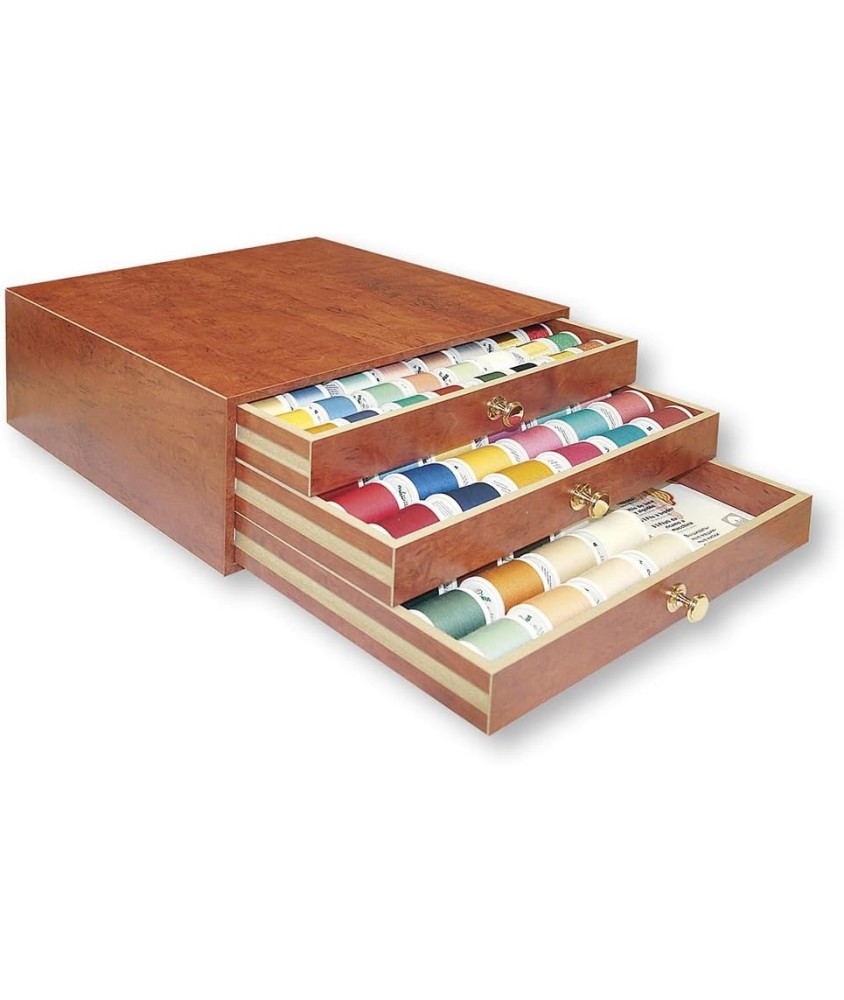 Fabriqué à la main en bois naturel massif, ce coffret à 3 tiroirs coulissants est une véritable œuvre de menuiserie. Dimensions : 36 × 36 × 14 cm. Les séparateurs intégrés maintiennent chaque bobine dans son logement dédié, facilitant la recherche et le remplacement des teintes. Un meuble rangement aussi fonctionnel qu'esthétique.