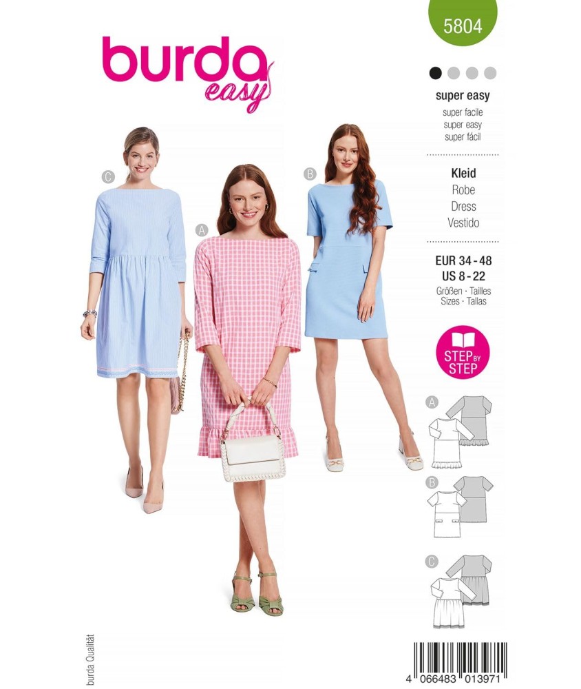 Patron Burda Easy n°5804 pour robe femme. Niveau Super Facile (1). Tailles 34-48.