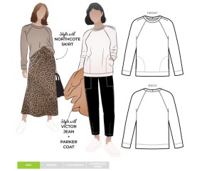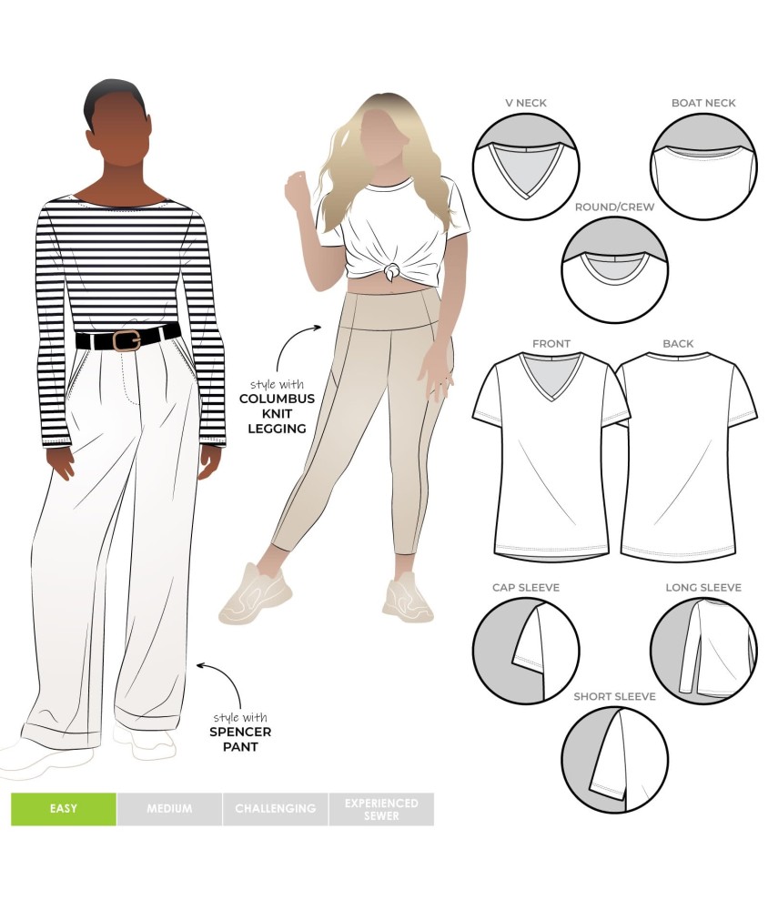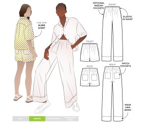 Toutes les pièces de coupe avec indication du droit fil, crans d'assemblage et marges de couture. Instructions illustrées pas à pas pour une réalisation facile et soignée.