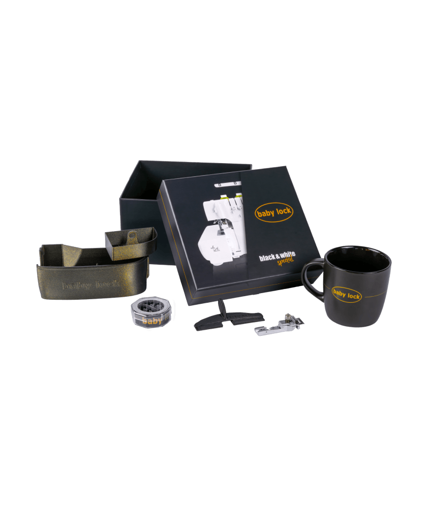 Offrez-vous ou faites plaisir avec ce magnifique Coffret Édition Spéciale Black & White, conçu exclusivement pour la surjeteuse Babylock Enspire. Ce set incontournable réunit 5 accessoires soigneusement sélectionnés : un mug Baby Lock pour la pause couture, un mètre-ruban de précision, un bac récupérateur en édition exclusive, un pont à coudre et un pied pose-élastique. Le cadeau parfait pour toute passionnée de couture !