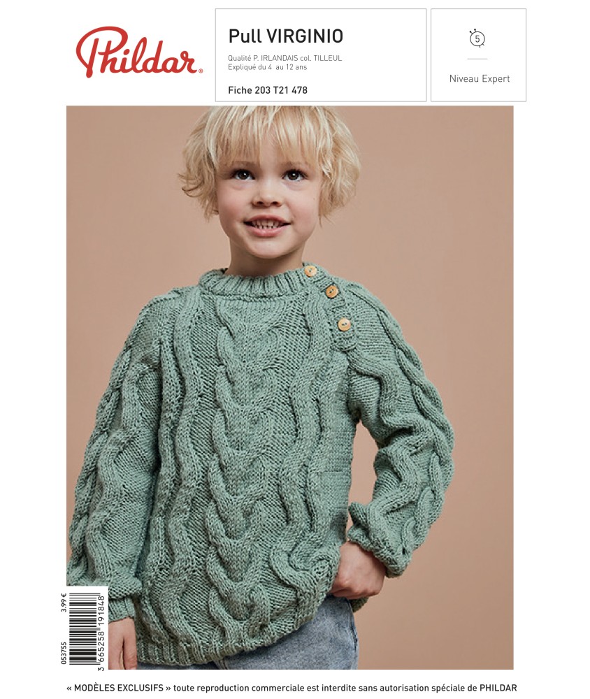 Relevez le défi avec ce splendide pull Virginio pour enfant en Phil Irlandais de Phildar. Un modèle de niveau expert avec un superbe travail de points fantaisie irlandais, emmanchures raglan et boutonnage épaule. Expliqué du 4 au 12 ans. 19 pages de patron PDF à télécharger immédiatement.