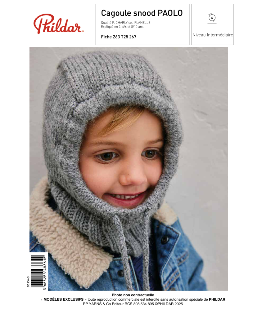 Cagoule Snood PAOLO par Phildar – Patron tricot enfant téléchargeable (PDF). Cet accessoire 2-en-1 combine une cagoule chaude et un snood intégré en Phil Charly coloris Flanelle. Niveau intermédiaire, tailles 2 à 10 ans. Tricoté en côtes 2/2 et jersey, 100% Acrylique, avec lien i-cord décoratif. Téléchargement immédiat après achat.