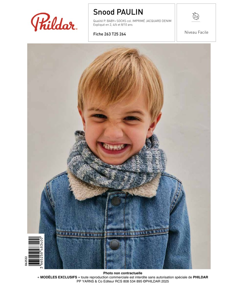Snood PAULIN Phildar, patron enfant PDF, Phil Baby+ Socks Jacquard Denim, 75% mérinos 25% polyamide, jersey circulaire, aig circulaire 2.5, tailles 2-10 ans, niveau facile, snood torsadé (Möbius), téléchargement immédiat