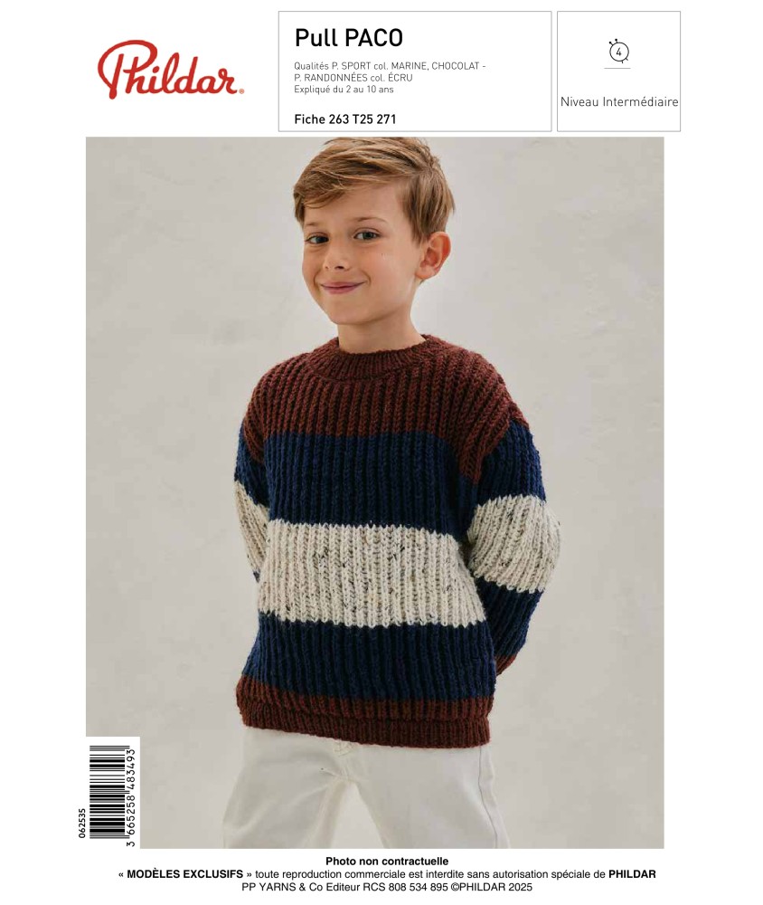Pull PACO Phildar, patron enfant PDF, Phil Sport Marine/Chocolat + Phil Randonnées Écru, côtes anglaises, 47% acrylique 36% laine 12% laine 3% alpaga 2% viscose, aig 3.5 et 4, tailles 2-10 ans, niveau intermédiaire, téléchargement immédiat