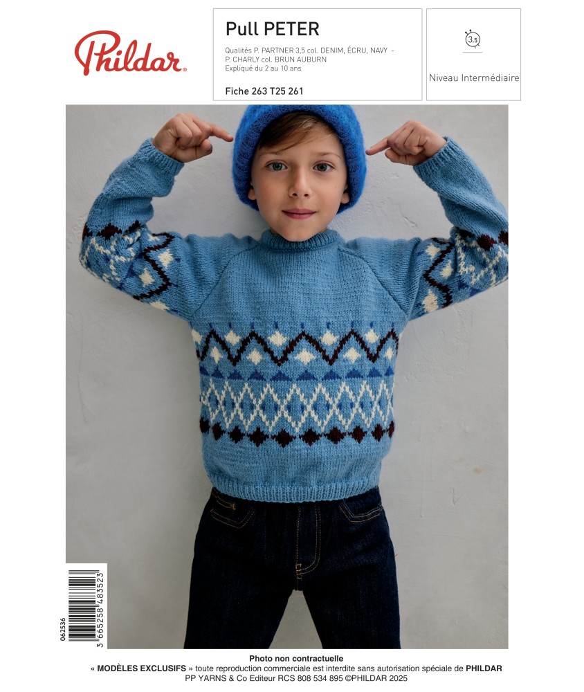 Pull PETER par Phildar – Patron tricot enfant téléchargeable (PDF). Ce pull jacquard multicolore en Phil Partner 3,5 et Phil Charly offre un rendu graphique unique. Niveau intermédiaire, tailles 2 à 10 ans. Composition 44% Polyamide, 34% Acrylique, 22% Laine peignée. Aiguilles n°3 et 3,5. Diagramme jacquard inclus. Téléchargement immédiat après achat.