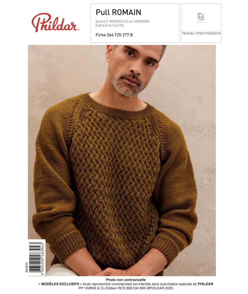 Découvrez le Pull ROMAIN, un patron de tricot homme premium signé Phildar, conçu exclusivement en Phil Mérinos 3,5 (version B en Mordoré). Ce pull sophistiqué combine le confort absolument inégalé de la laine mérinos 100% avec des points fantaisie subtils et des torsades élégantes. Avec ses trois nuances d'aiguilles (3, 3.5 et 4.5 mm), ce modèle intermédiaire s'adresse aux tricoteurs expérimentés cherchant à progresser. Disponible en cinq tailles (S 15-17 ans à XXL 54-56), ce pull offre un look raffiné et intemporel, parfait pour l'automne-hiver. Les diagrammes détaillés accompagnent chaque étape de création, garantissant un résultat professionnel et durable.