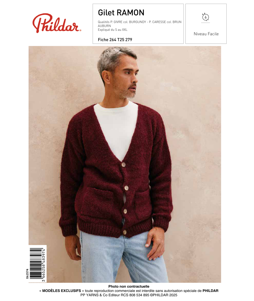 Découvrez le Gilet RAMON, un patron de tricot homme incontournable signé Phildar, parfait pour débuter les techniques d'assemblage ou progresser en tricot. Combinant la noblesse et la douceur de l'alpaga avec Phil Givre en Burgundy et Phil Caresse en Brun Auburn, ce gilet offre un look à la fois raffiné et décontracté. Avec 47% alpaga, 47% polyamide, 6% acrylique, ce gilet en jersey double fil assure un confort incomparable et une chaleur discrète. Aiguilles 5.5 et 6 mm, disponible du S au XXL, niveau facile — idéal pour une progression continue. Quatre boutons Ø25mm et diagrammes détaillés inclus. Un gilet que vous porterez pendant des années.