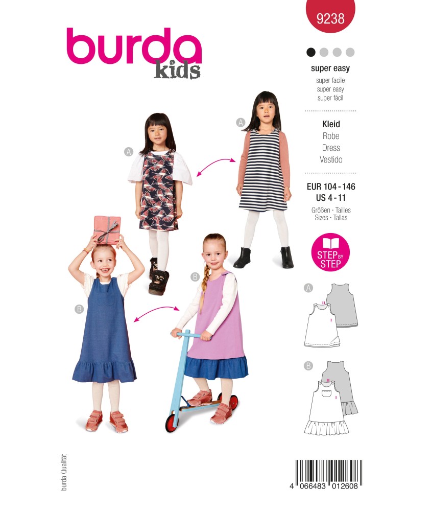 Découvrez 2 adorables robes évasées signées Burda Kids, pensées pour le confort, la liberté de mouvement et le style. Variante A : robe débardeur simple à enfiler, portée sur un tee-shirt à manches courtes — un combo stylé pour l'école ou les jeux de cour. Variante B : robe trapèze avec large ruché d'ourlet romantique qui virevolte à chaque pas, parfaite pour les occasions spéciales comme les anniversaires et les goûters d'amies. Astuce maline : les deux versions sont réversibles, pour deux looks en une seule couture ! Cousez-les dans des imprimés contrastants pour multiplier les possibilités. Parfait pour tissus en cotonnade, jersey, popeline, voile de coton ou fibres mélangées. Niveau super facile, idéal pour une première robe cousue main. Le patron Burda contient toutes les explications étape par étape pour un rendu de pro. 🧵 Tailles 104 à 146 cm (4–11 ans). Un projet couture qui fera briller les yeux de votre fille.