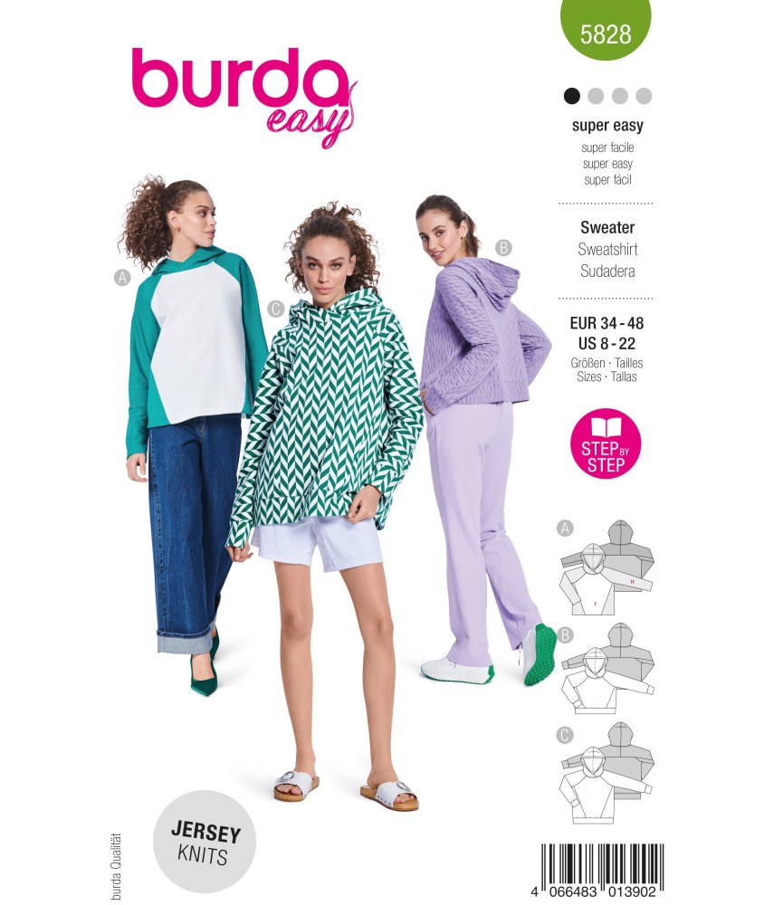 LE sweatshirt cocooning dans lequel on a envie de vivre tous les jours ! Variante A : sweat classique col rond à bords-côtes, manches longues, coupe légèrement oversize — le confort absolu version chic, parfait pour le weekend, le sport ou le télétravail. Variante B : version à capuche avec cordon, poche kangourou, l'esprit streetwear décomplexé — à porter avec un jean large, une jupe plissée ou un short cargo. Les bords-côtes aux poignets, ourlet et col apportent une finition très pro. Un patron idéal pour recycler un tissu sweat d'une vieille pièce ou tester les molletons fantaisie (chinés, imprimés, brodés). À coudre en molleton gratté, sweat bio, french terry, néoprène léger ou polaire. Niveau facile — la couture en molleton est plus simple qu'on ne le croit et Burda vous guide pour tous les détails. 🔥 Tailles FR 34-44.