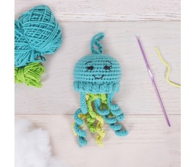 Kit de crochet amigurumi Méduse — Trimits. Tout le matériel nécessaire pour crocheter un adorable méduse en un seul kit complet. Dimensions finies : 8 x 8 x 18 cm. Référence TCRK007. Idéal pour les débutants comme pour les crocheteuses expérimentées. Un cadeau parfait pour les amateurs de crochet créatif.