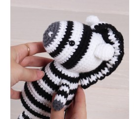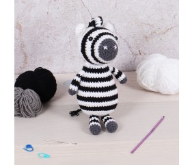 Kit de crochet amigurumi Zèbre — Trimits. Tout le matériel nécessaire pour crocheter un adorable zèbre en un seul kit complet. Dimensions finies : 12 x 10,5 x 23 cm. Référence TCRK010. Idéal pour les débutants comme pour les crocheteuses expérimentées. Un cadeau parfait pour les amateurs de crochet créatif.