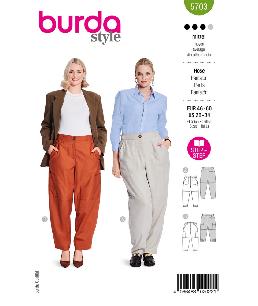 Ces deux patrons de pantalons sont parfaits pour les couturières expérimentées. Le premier pantalon cargo séduit par ses surpiqûres discrètes et sa coupe sportive et élégante, qui convient aussi bien pour le bureau que pour une tenue décontractée avec des sneakers. La deuxième coupe séduit par sa forme baril très tendance, ses poches plaquées et ses brides réglables à l'ourlet - pour un look personnalisé. Les deux modèles offrent de nombreuses possibilités de création !