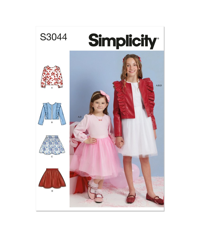 Patron Simplicity S3044 qui réunit plusieurs incontournables de la garde-robe enfant : un top en maille à épaules froncées, une veste à volants romantique et deux modèles de jupes au choix. Un patron polyvalent pour habiller vos petites filles avec style, du 3 au 6 ans.