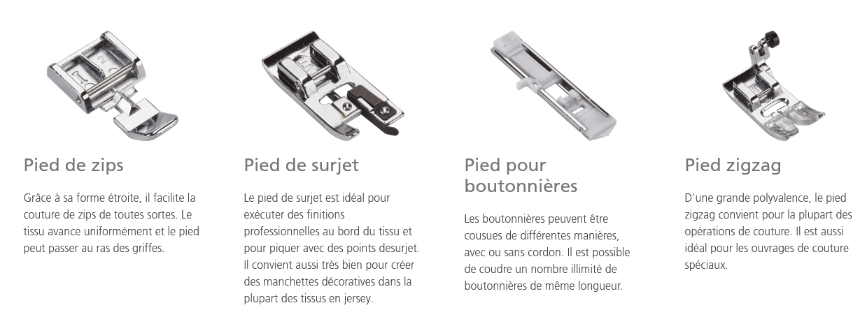 Avec les 6 semelles de pied-de-biche incluses, vous pouvez commencer à coudre vos propres créations.