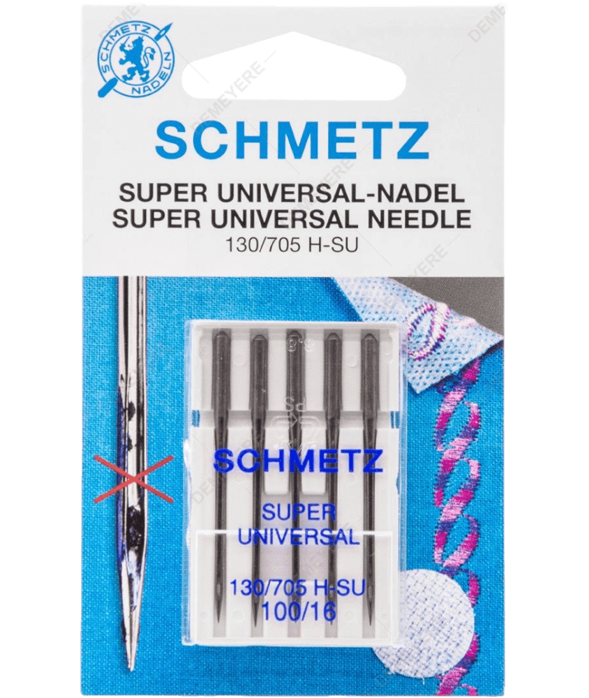 Avec la nouvelle aiguille Super Universal, vous pouvez désormais apporter la norme de l'industrie dans votre maison. La particularité remarquable de l'aiguille Super Universal est son revêtement antiadhésif particulièrement glissant avec du NIT (nickel-phosphore-PTFE). Ce revêtement garantit que beaucoup moins de résidus de colle collent à l'aiguille et empêchent ainsi le fil de se déchirer.