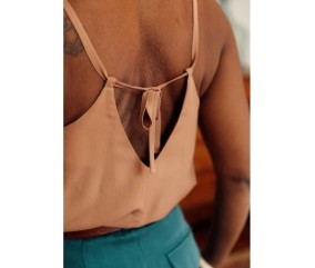 Niveau de couture : intermédiaire. Le gros point technique est la pose du biais encolure qui se prolonge pour former les bretelles.
