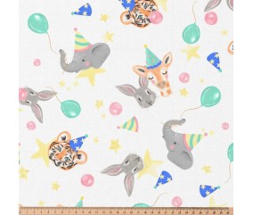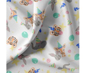 - Impression numérique : Les motifs sont réalisés par impression numérique, permettant des détails fins et des couleurs vives. Le design met en scène des animaux joyeux tels que des tigres, des éléphants, des girafes et des lapins, tous imprimés avec des couleurs éclatantes sur un fond blanc.